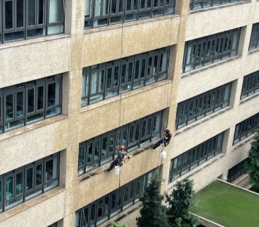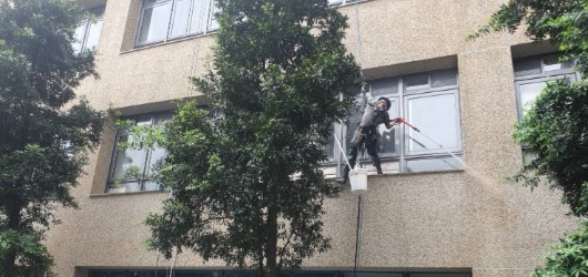 使用高壓水刀進行牆面清洗,有效處理高層牆面黏附的灰塵與霉斑。